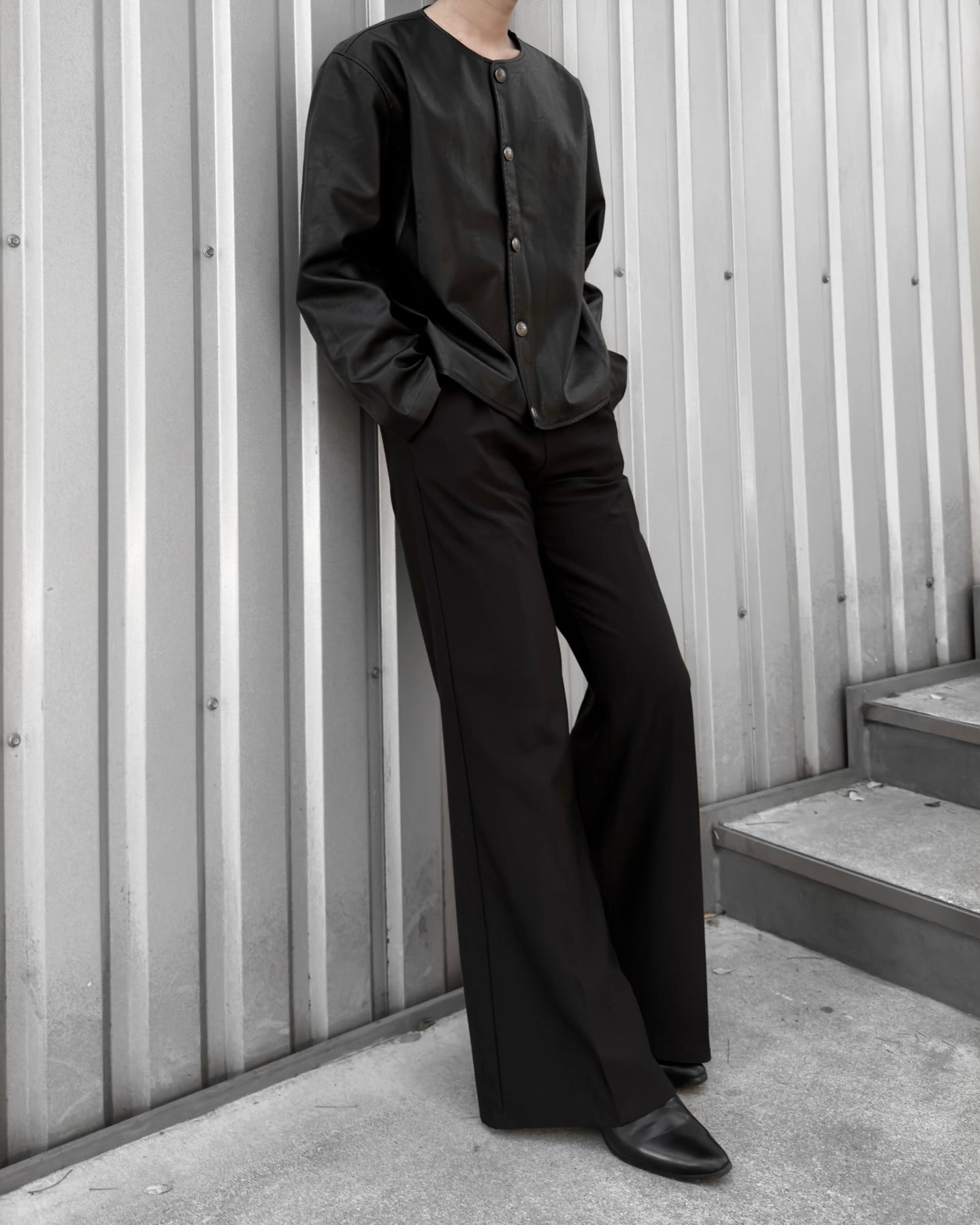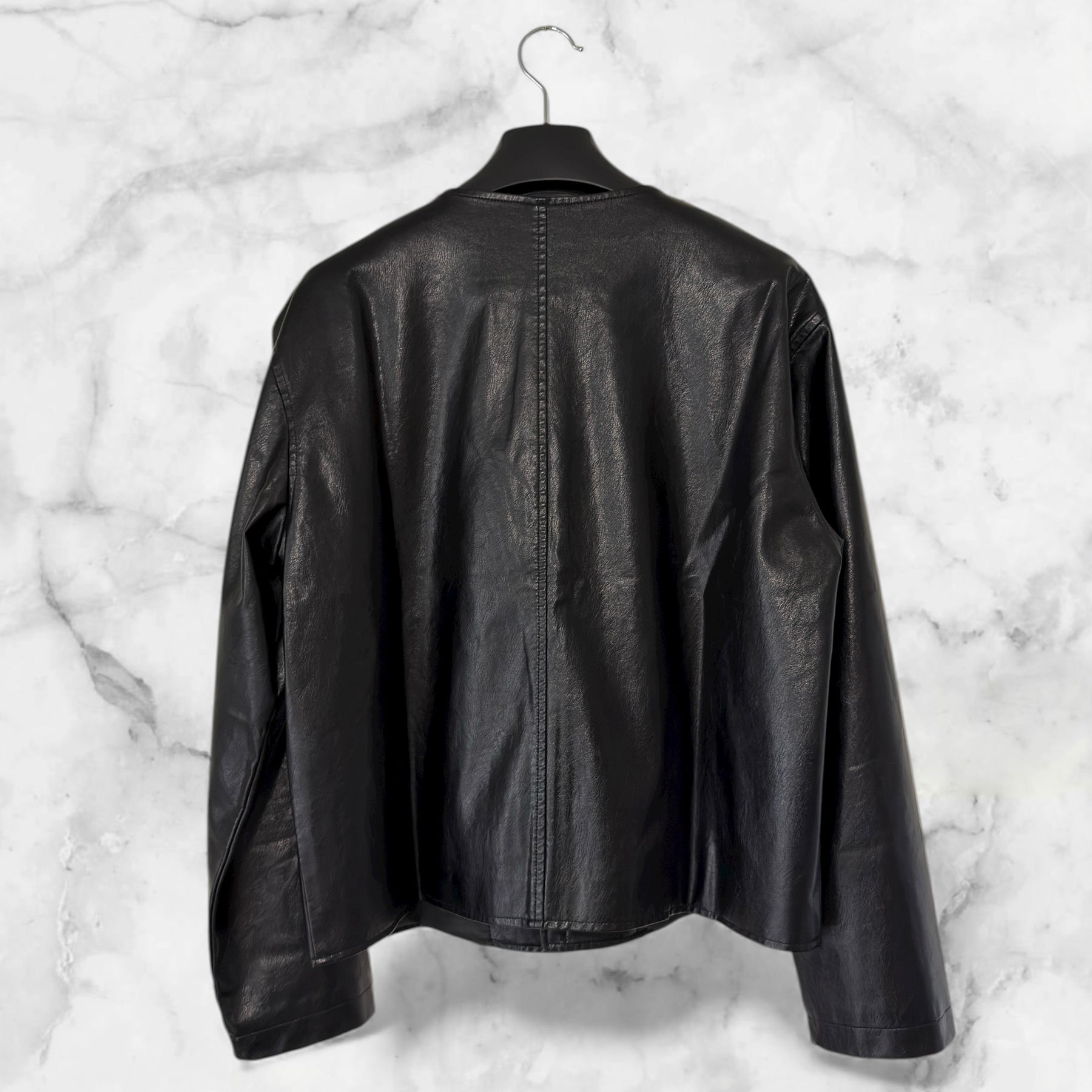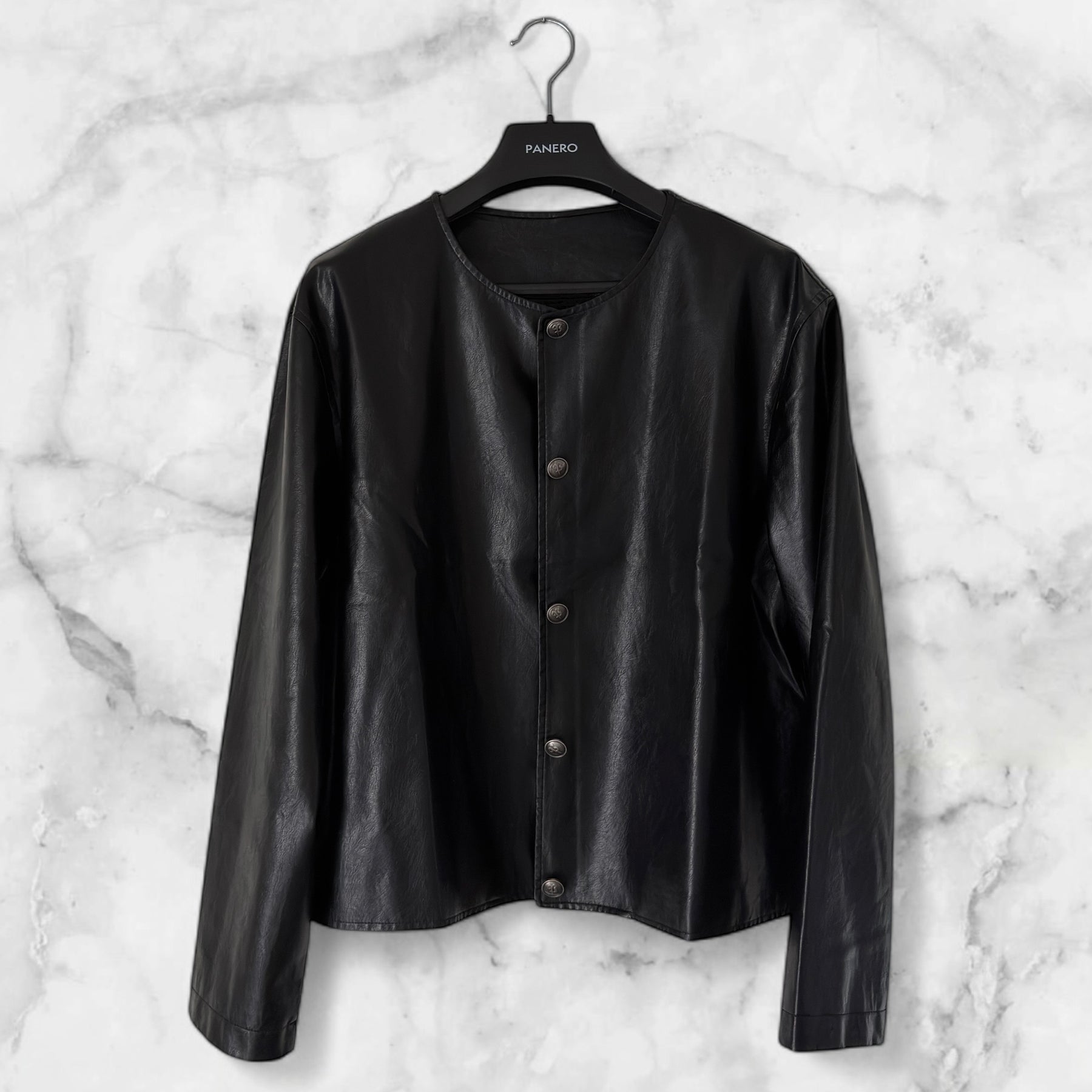 上質なシンセティックレザーを採用し、カーディガンのような軽やかさと、ジャケットとしての存在感を両立した一着。無駄を削ぎ落としたミニマルな佇まいは、羽織るだけでスタイル全体を洗練された印象へ。