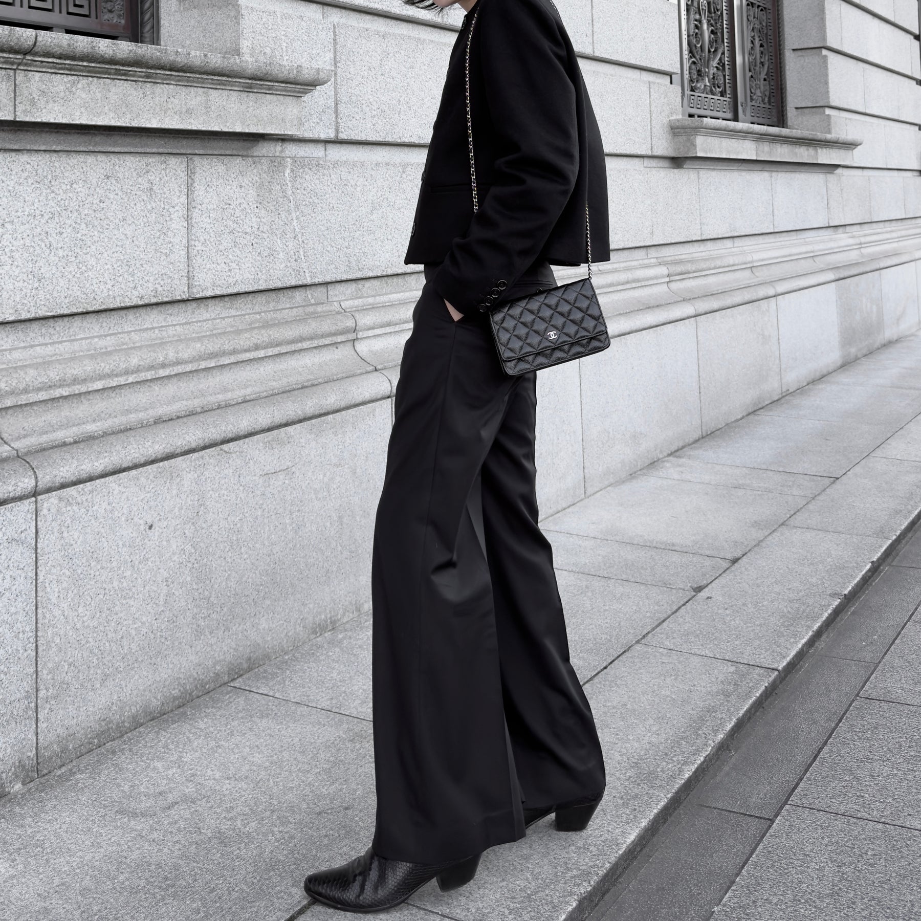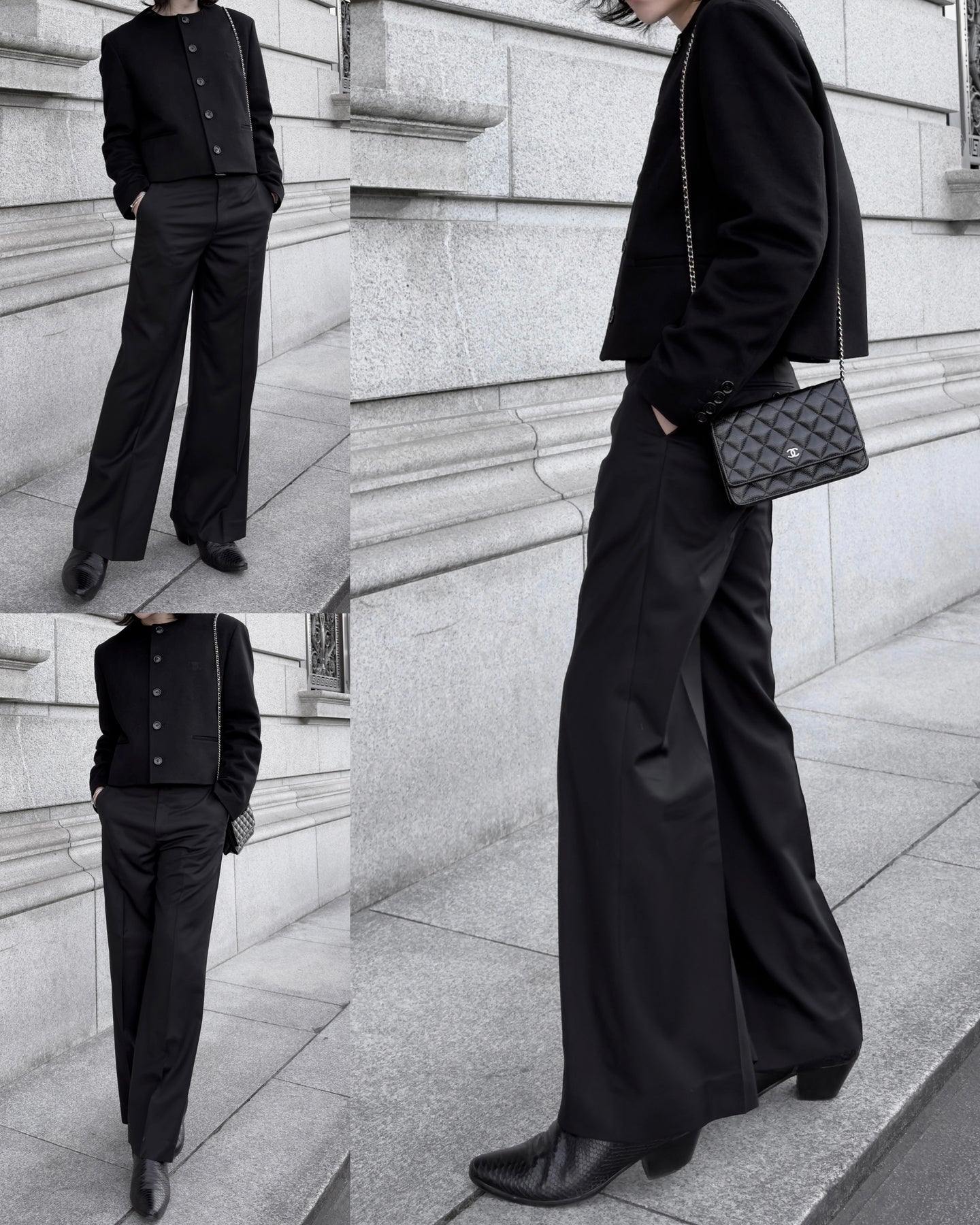 These wide flare slacks balance an easy drape with a polished finish, creating length and presence in one line.
