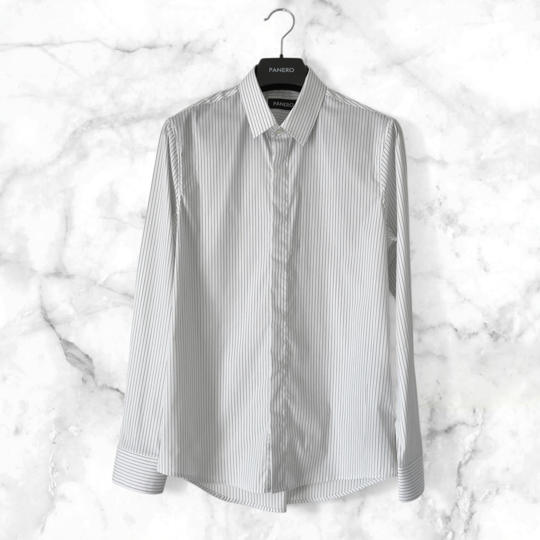 The front uses a hidden placket for a cleaner finish. It sharpens the stripe pattern and adds a modern, understated mood.