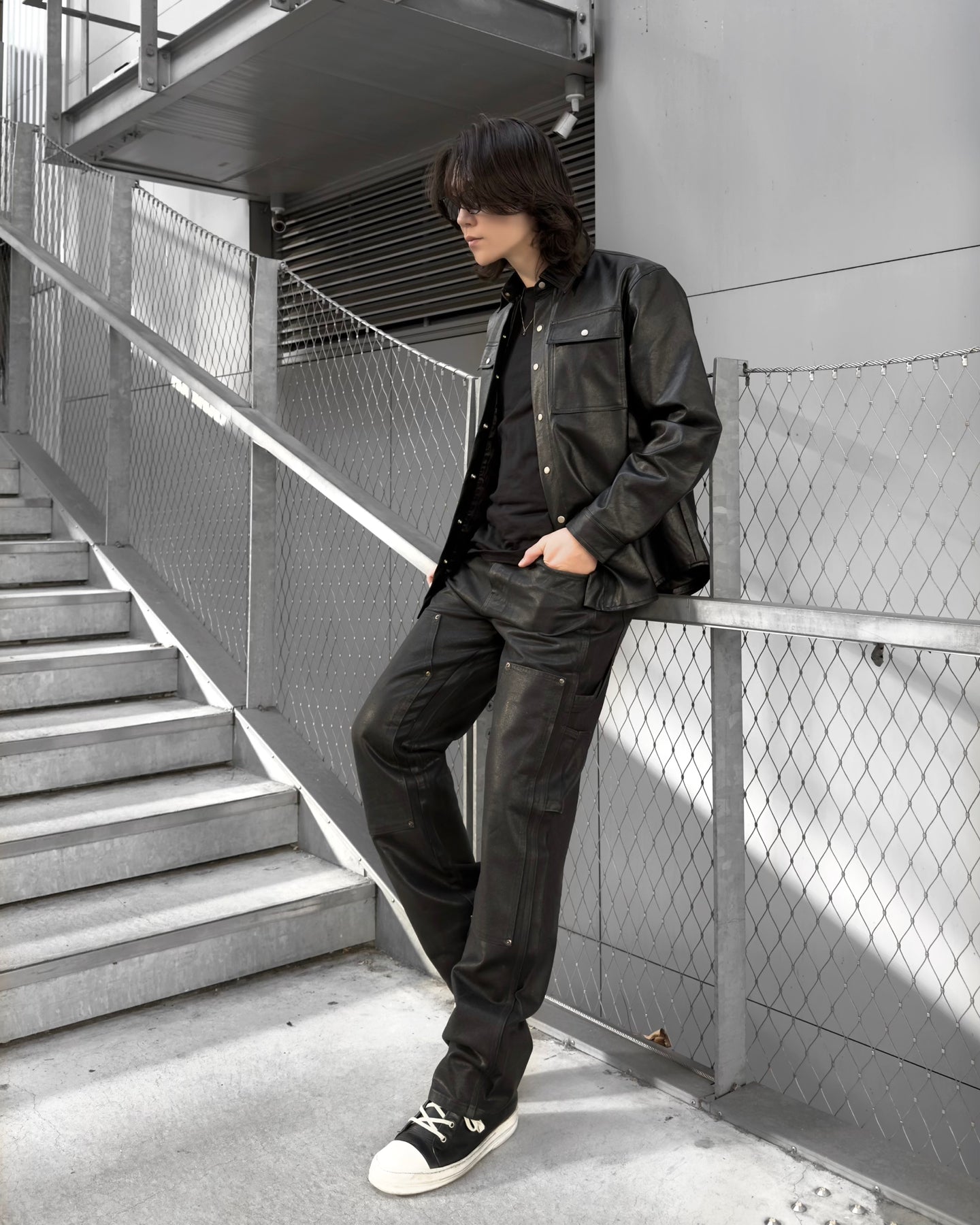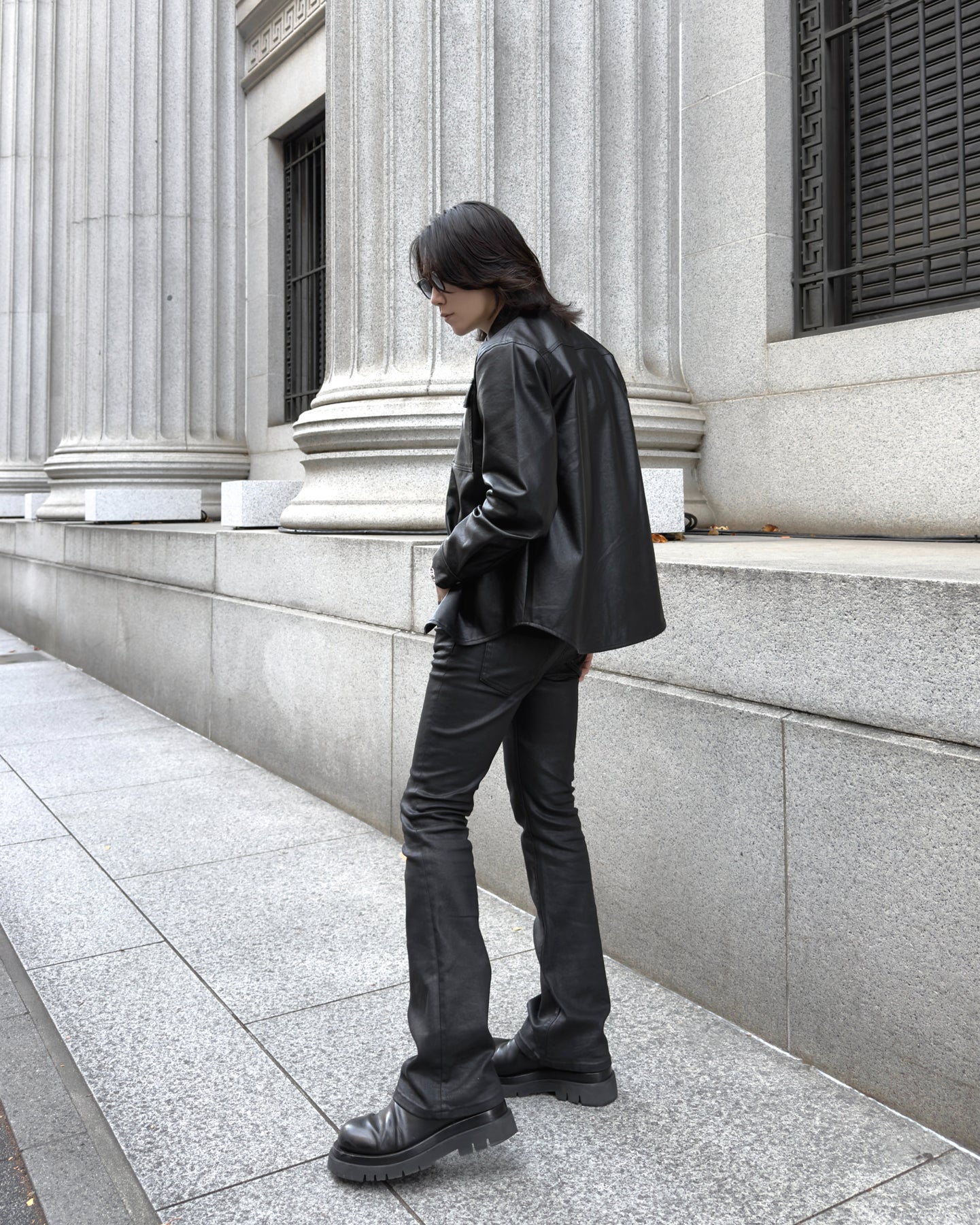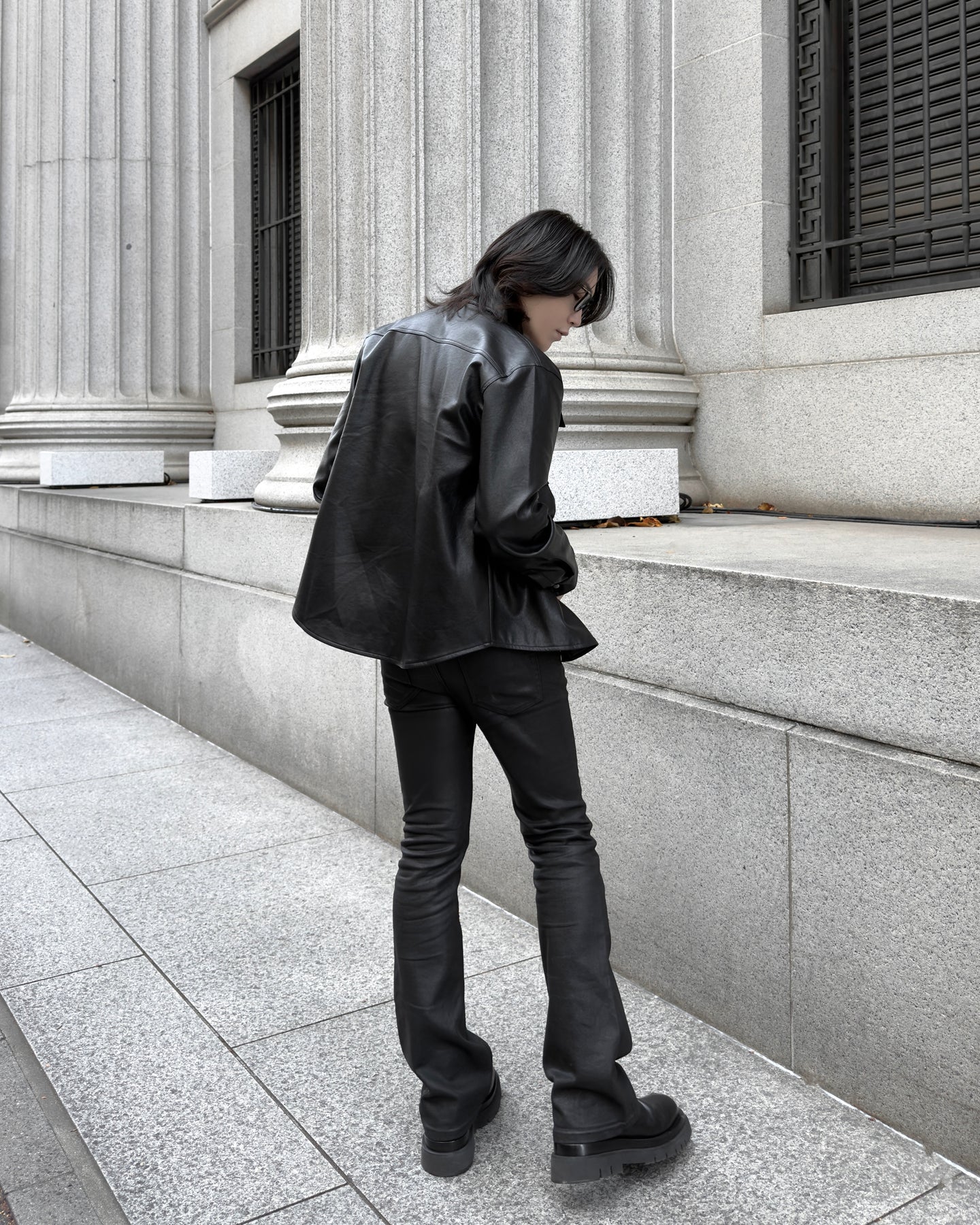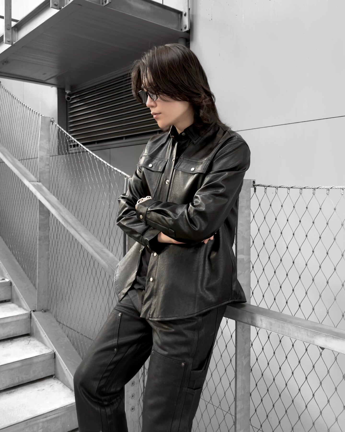 A leather shirt jacket with a fashionable presence based on the structure of a shirt.