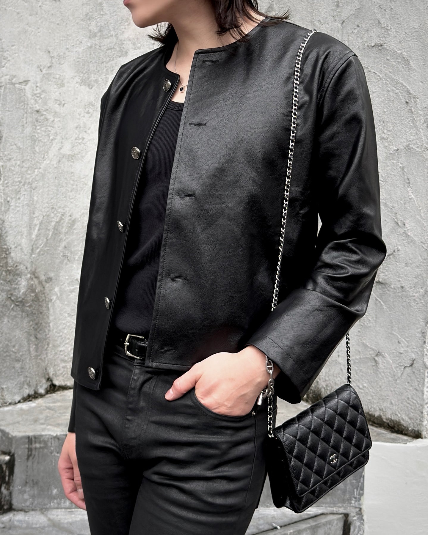 上質なシンセティックレザーを採用し、カーディガンのような軽やかさと、ジャケットとしての存在感を両立した一着。無駄を削ぎ落としたミニマルな佇まいは、羽織るだけでスタイル全体を洗練された印象へ。